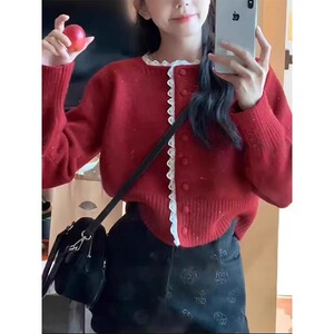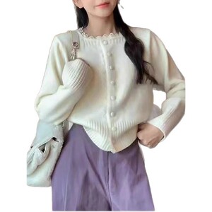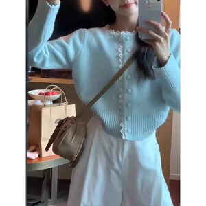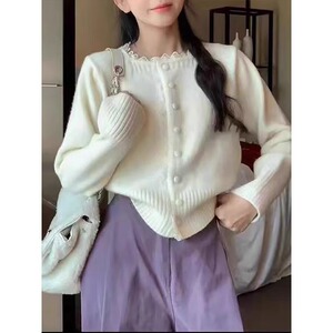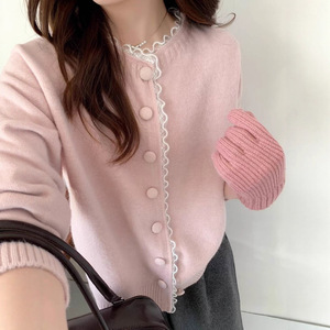 法式春秋蕾丝花边时尚单排扣温柔风宽松甜美针织毛衣开衫外套打底