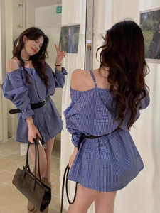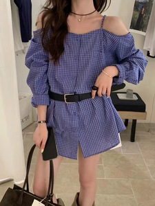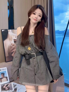 韩系设计感格子露肩衬衫女2025春季新款宽松显瘦百搭小个子上衣潮