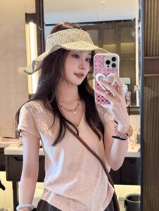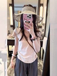 小香风粉色v领正肩短袖t恤女夏季薄款收腰显瘦竹节棉短款上衣