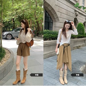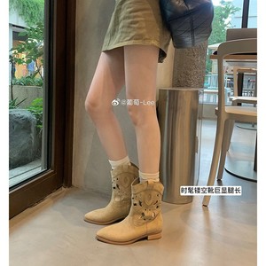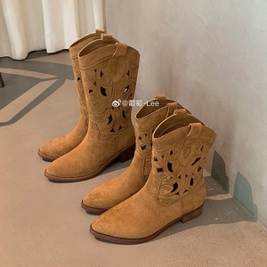 葡萄妈现货秒发~ 两个颜色~辣妹尖头镂空刺绣中短筒粗跟西部靴女