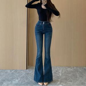 深色高腰双扣丰胯提臀微喇牛仔裤女2025秋季新款弹力显瘦喇叭长裤
