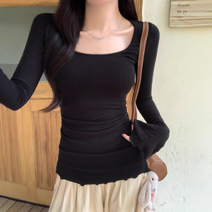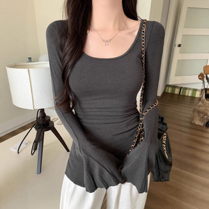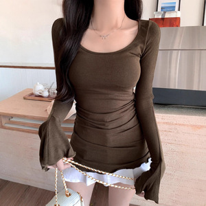 纯棉长袖T恤女春秋显瘦修身百搭喇叭袖上衣韩版冬季体恤外穿小衫