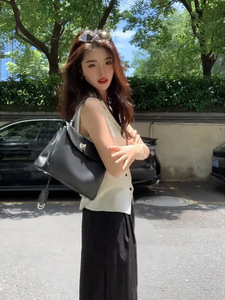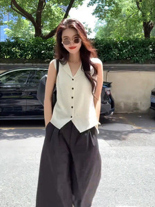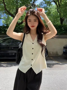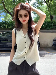 老钱风薄款坎肩无袖背心上衣女夏季短款翻领针织开衫马甲