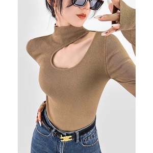 黑色镂空半高领挂脖内搭打底衫女秋冬纯欲修身针织衫锁骨上衣秋季