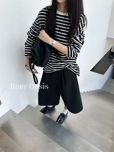 韩版宽松ins风条纹长袖T恤一秋季新款潮流大码设计感小众女5S170