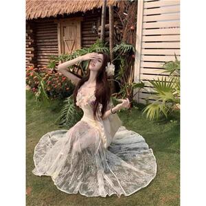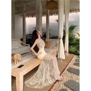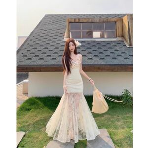 法式绝美度假风立体花朵吊带连衣裙夏季新款纯欲纱网拼接鱼尾长裙