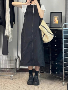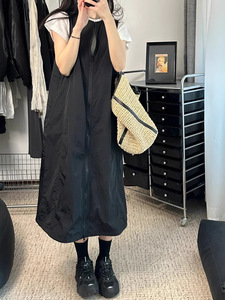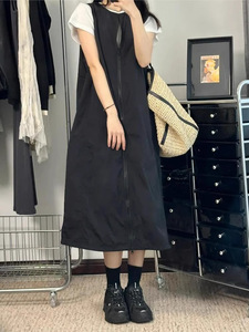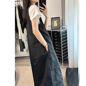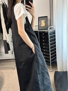山系黑色工装机能风背心裙女春秋款连衣裙微胖大码胖mm显瘦背带裙