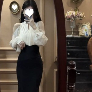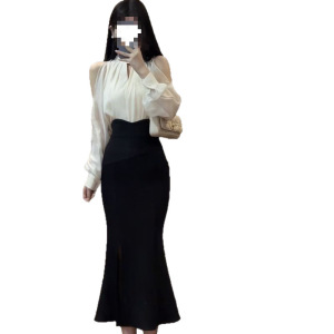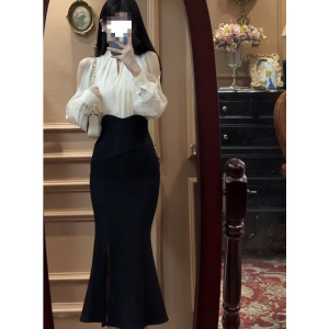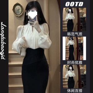 2025春秋新款挂脖露肩设计感长袖上衣气质高腰鱼尾长裙时尚套装女