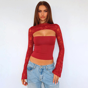 Y25TP314欧美风跨境女装秋季亚马逊新款纯色圆领镂空蕾丝拼接上衣