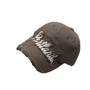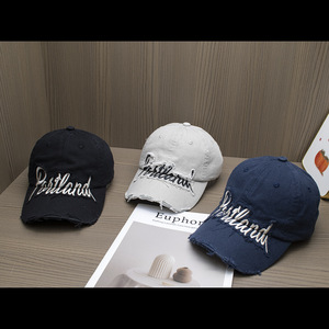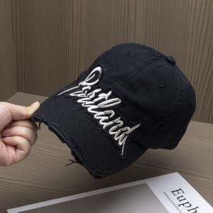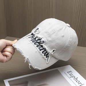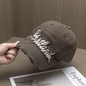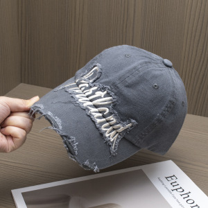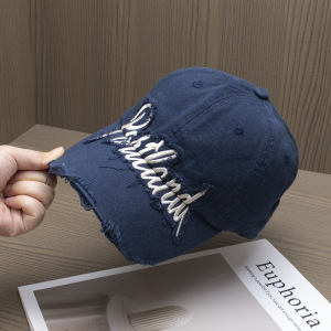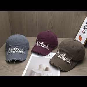 韩系字母刺绣棒球帽女破洞磨边做旧鸭舌帽宽帽檐大头围显脸小帽子