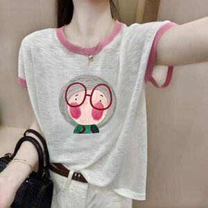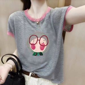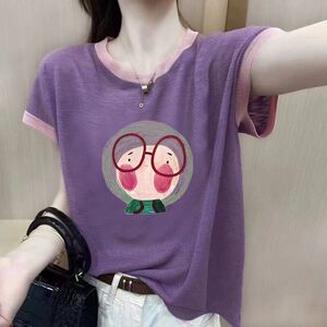 竹节棉短袖T恤女夏装2025新款大码宽松显瘦遮肚撞色印花上衣