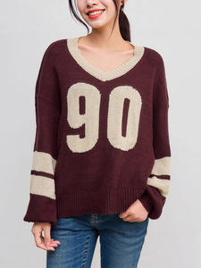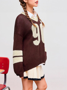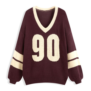 跨境欧美新款宽松感字母毛衣上衣撞色v领运动风长袖针织衫女