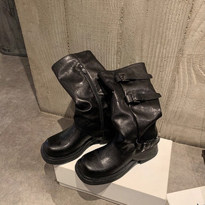 葡萄妈同款增高皮带扣方圆头褶皱中筒骑士靴女西部褶皱堆堆裤管靴