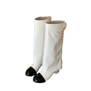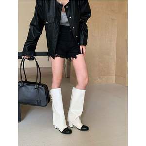 米色小香风气质圆头拼色骑士靴女秋气质粗跟不过膝宽松裤管长靴