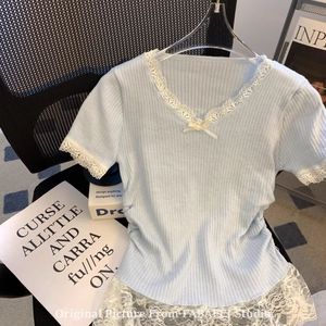 甜美蝴蝶结蕾丝边拼接短袖t恤女夏季2025新款V领显瘦法式裙摆上衣