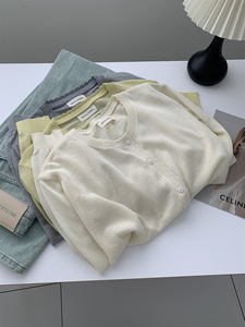 早秋温柔复古花边圆领绵羊毛针织小开衫女简约韩系百搭薄毛衣外套