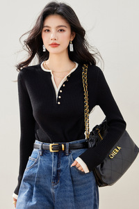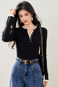 实拍◆现货拼接假两件绵羊毛针织衫女2025年款撞色韩版显瘦毛衣