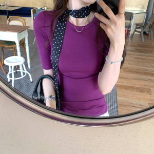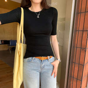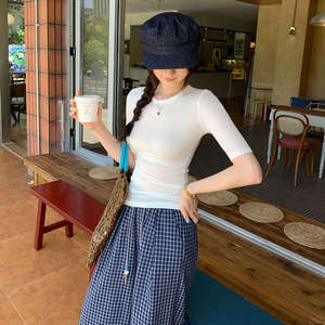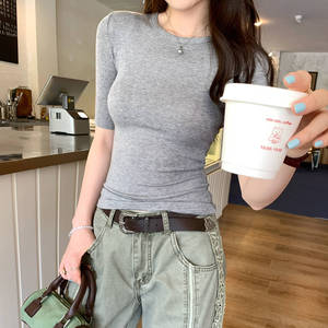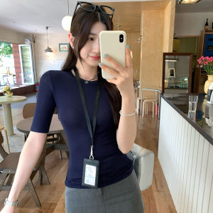 莱赛尔天丝藏青色圆领正肩短袖T恤女2025夏季韩系独特绝美小上衣