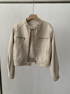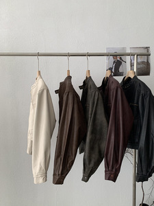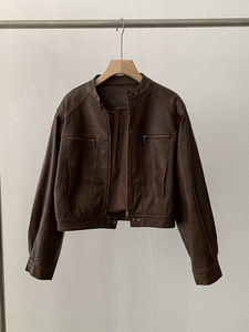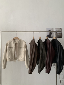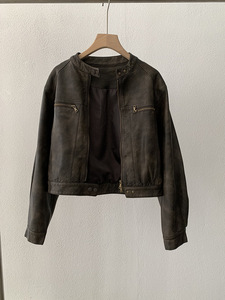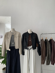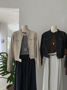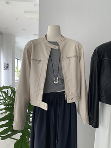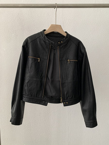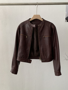 欧玛莱 纯色圆领皮质时尚外套2025秋装新款长袖拉链上衣实拍 4200