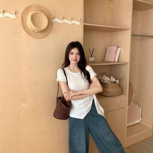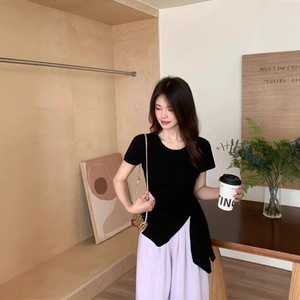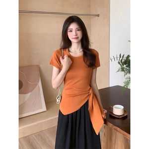 韩版时尚不规则绑带圆领短袖针织上衣女夏季温柔甜美修身正肩上衣