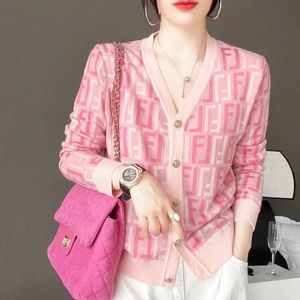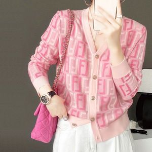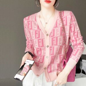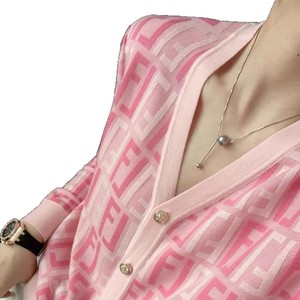 欧洲站春装新款领长袖粉色字母提花新品开衫毛衣外套上衣