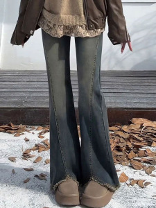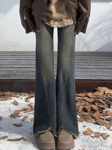 复古蓝毛边微喇牛仔裤女夏季新款大码胖mm高腰显瘦遮胯弹力喇叭裤
