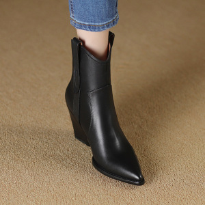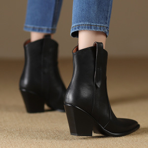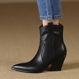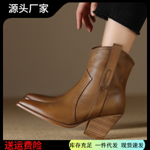 2024秋冬真皮短靴女复古风棕色马丁靴尖头粗跟高跟切尔西靴时装靴