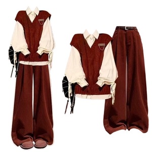 秋冬套装女感2025韩版学院风针织马甲长袖衬衫搭休闲裤三件套