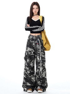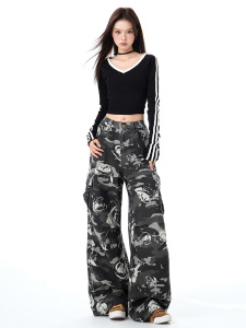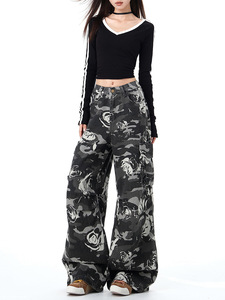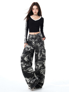 美式迷彩印花直筒裤2025秋季新款高腰显瘦宽松休闲牛仔裤子