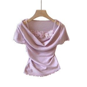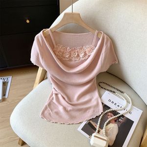 小众纯欲辣妹假两件短袖T恤女装2025年夏季新款木耳边荡领针织衫