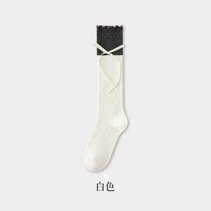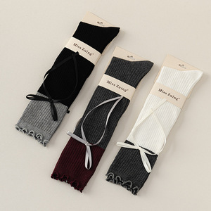 miu系袜子女甜美丝带蝴蝶结小腿袜2025秋季新款木耳边拼色堆堆袜