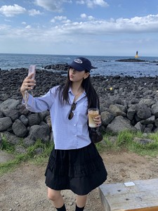 广州黄峥法式复古蓝色格子条纹POLO领防晒衬衫宽松休闲衬衣530719