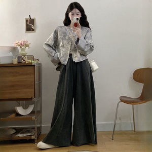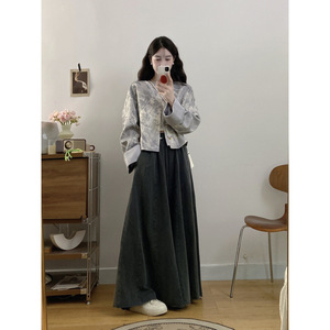 大码套装女秋季高级感新中式国风盘扣短外套阔腿裤裙两件套A5803