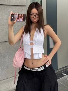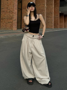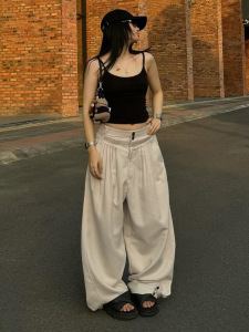 街头辣妹工装挂脖绑带显瘦背心宽松长裤两件套垂感褶皱直筒休闲裤
