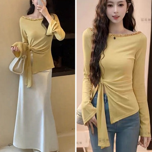 2025秋冬新品设计感露斜肩个性系带显瘦修身百搭小众上衣针织衫女