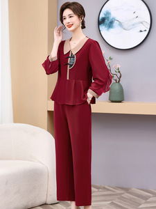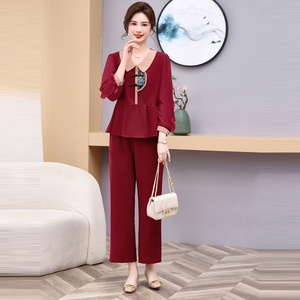 中年妈妈夏装新款洋气中老年女装春秋季国风衬衫套装贵夫人两件套