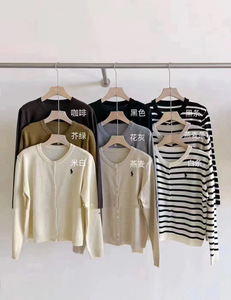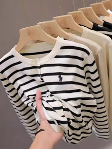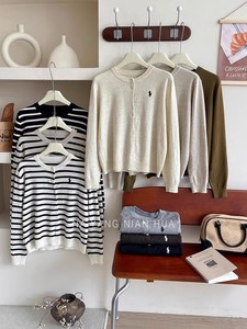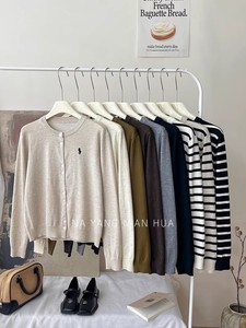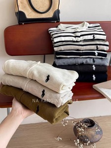 韩系复古软糯羊绒小马刺绣毛针织开衫女秋条纹外套休闲百穿搭上衣