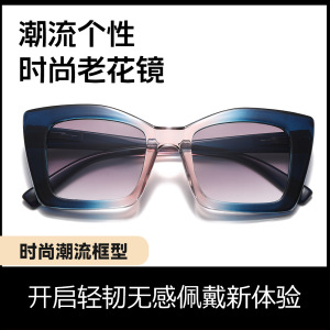 新款欧美跨境太阳渐进色老花眼镜大框老花女平光弹簧高清眼镜批发