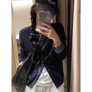 格雷系穿搭chic假两件针织开衫女2025春季格纹拼接上衣单排扣外套