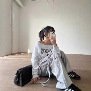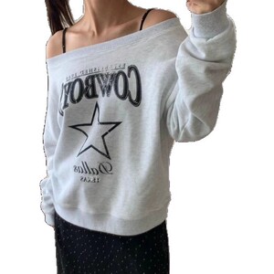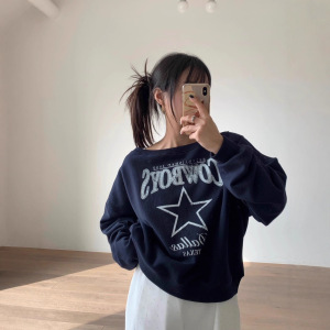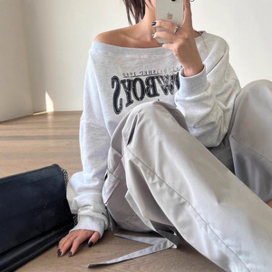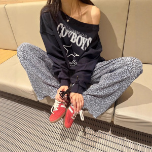 美式复古藏青色斜肩卫衣女秋季2025新款宽松慵懒风甜辣妹长袖上衣