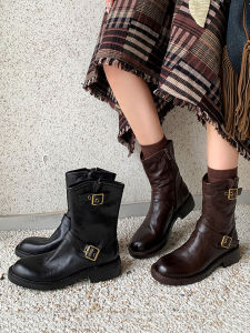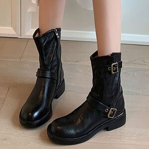 店主强推~法式圆头侧拉链马丁靴女皮带扣粗跟短靴时尚感百搭洋气