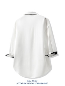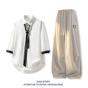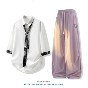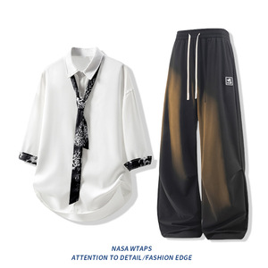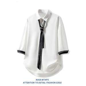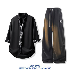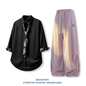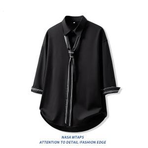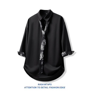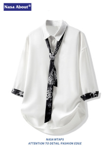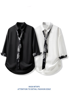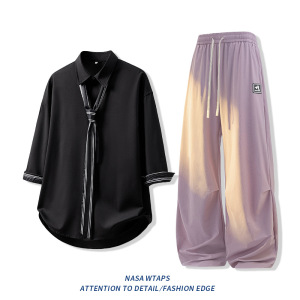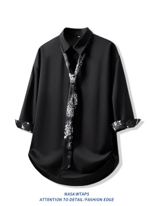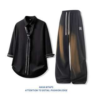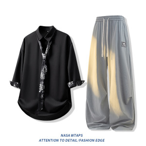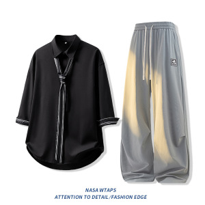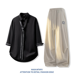 NASA凉感七分袖衬衫男夏季新款垂感冰丝薄款高级感痞帅衬衣男套装