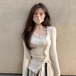 秋季女装设计感木耳边长袖针织打底衫新款不规则开叉独特别致上衣