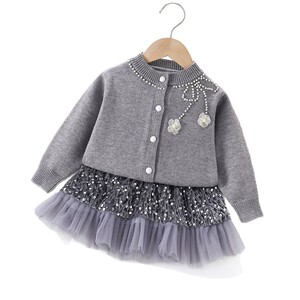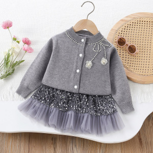 女童毛衣套装秋冬季新款韩系洋气钉珠花朵针织开衫亮片短裙两件套