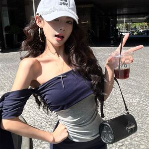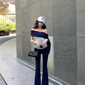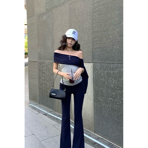 设计感不规则撞色斜肩短袖T恤上衣女夏季气质喇叭裤修身长裤套装