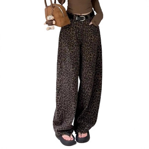 美式设计感豹纹牛仔裤女新款高腰垂感显瘦阔腿裤大码直筒拖地长裤