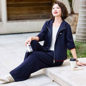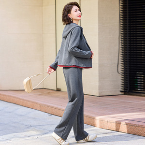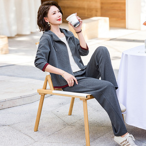妈妈秋装套装女新款中老年连帽洋气外套时尚上衣休闲两件套运动服