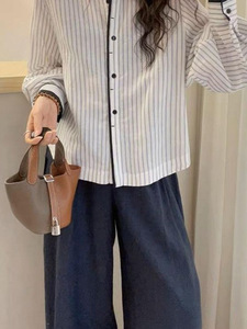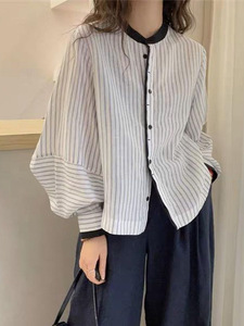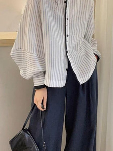灯笼袖竖条纹休闲衬衫女2025早秋新款女装设计感上衣潮
