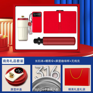 【红色五件套】咖啡杯+长扣本+签字笔+八骨伞+3C支架充电宝