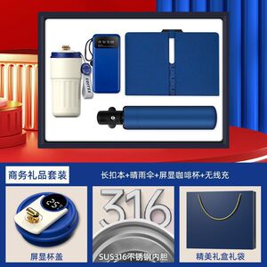 【蓝色五件套】咖啡杯+长扣本+签字笔+八骨伞+3C支架充电宝
